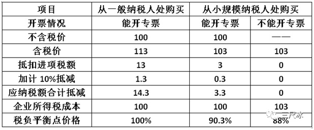 結(jié)論:在能取得增值稅專(zhuān)用發(fā)票的情況下,小規(guī)模納稅人的含稅價(jià)應(yīng)該比一般納稅人便宜3.3元(價(jià)格為一般納稅人價(jià)格的96.9%);價(jià)格高于96.9%,從一般納稅人處購(gòu)買(mǎi)更合算,反則反之。如果小規(guī)模納稅人不能開(kāi)專(zhuān)票,小規(guī)模納稅人的含稅價(jià)應(yīng)該比一般納稅人便宜5.85元(價(jià)格為一般納稅人價(jià)格的94.5%);價(jià)格高于94.5%,從一般納稅人處購(gòu)買(mǎi)更合算,反則反之。